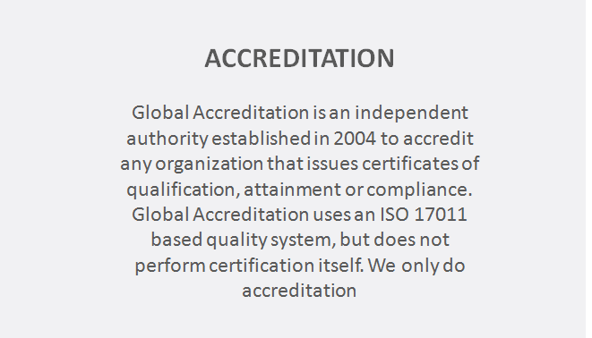 Global Accreditation (GA) is an autonomous body responsible for providing accreditation of conformity assessment bodies (GAs) in the fields of certification and inspection. Accreditation by GA demonstrates the competence and independence of these GAs.