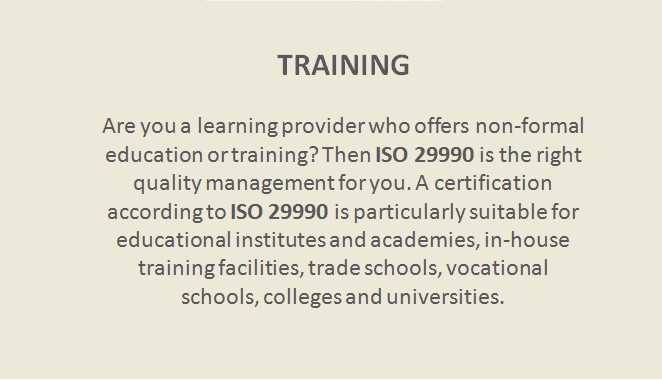 ISO 29990 is a quality management system standard for providers of education and training services. ISO 29990 provides a unified model for a quality and professional mode of operation, as well as a common reference point for both LSPs and their clients for the conceptualisation, development and delivery of the specified programme.